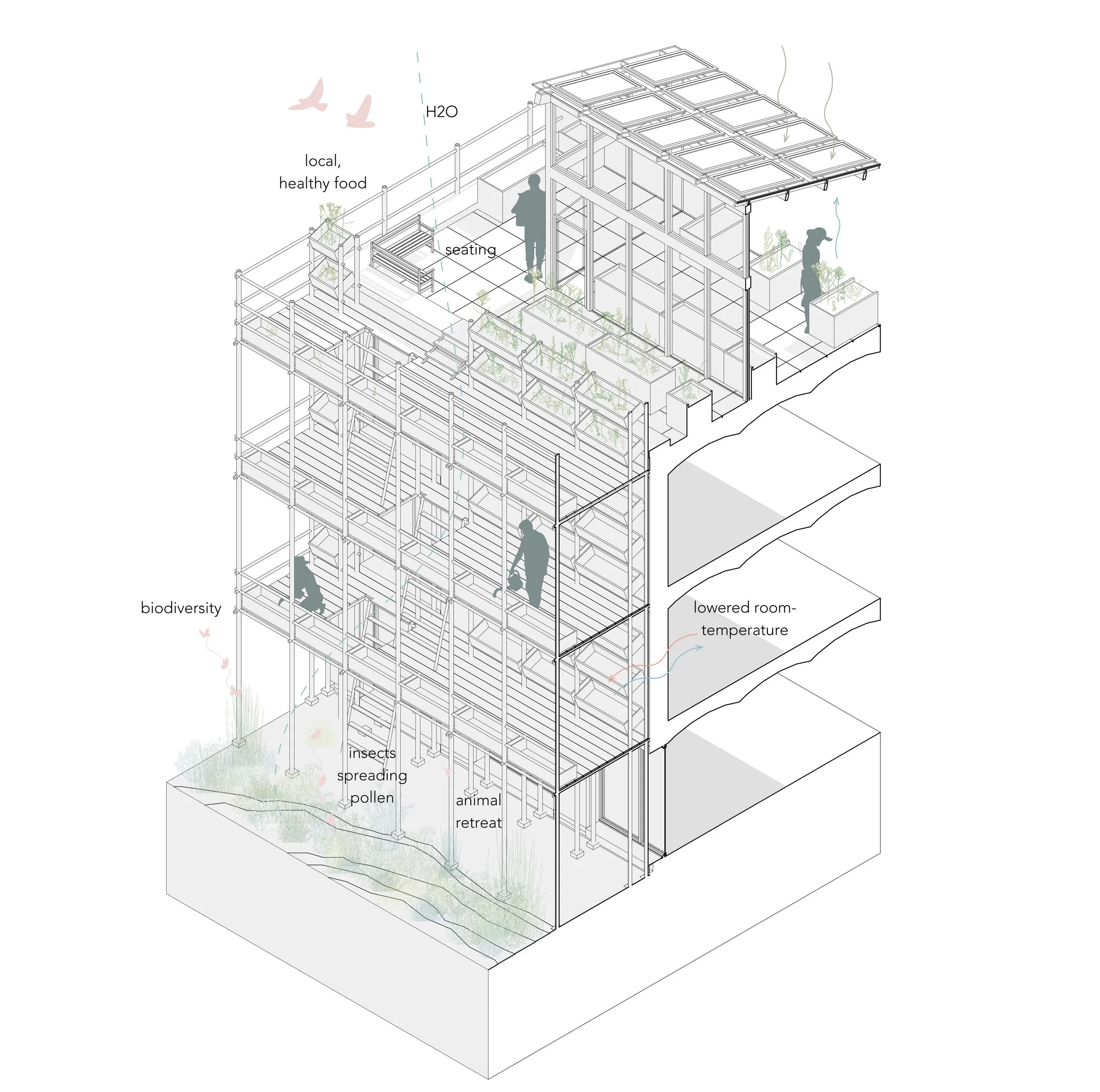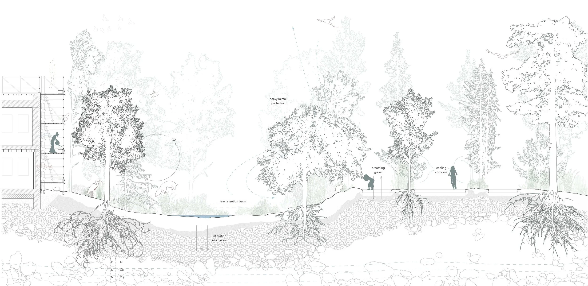 Good Ground Gardens versteht Stadt nicht als statisches Gefüge, sondern als lernendes Ökosystem. Durch die Verzahnung von Agroökologie, Mobilität und sozialer Infrastruktur entsteht eine produktive Landschaft, die Gesundheit fördert, ökologische Resilienz aufbaut und neue Formen des gemeinschaftlichen Zusammenlebens ermöglicht.