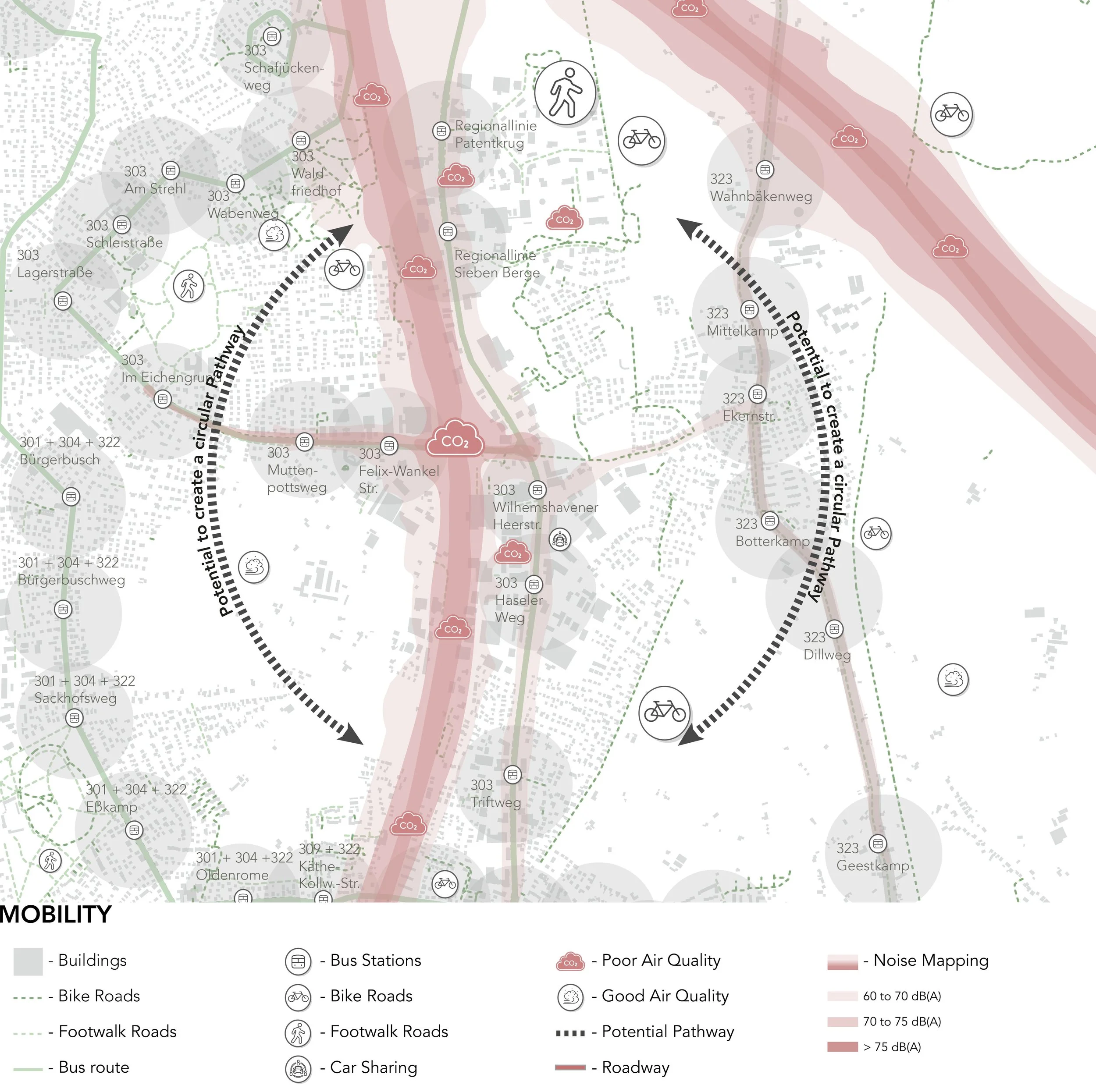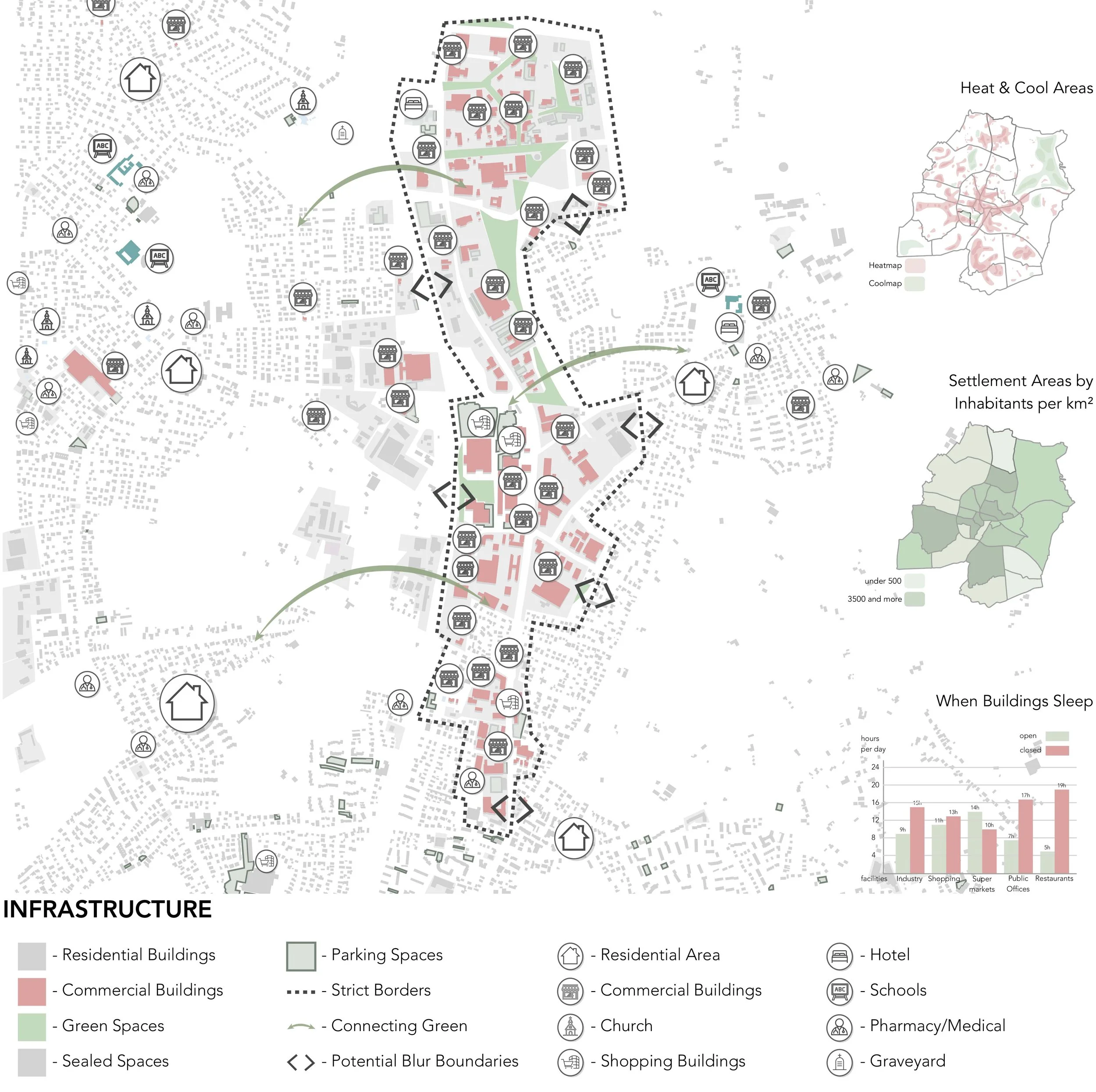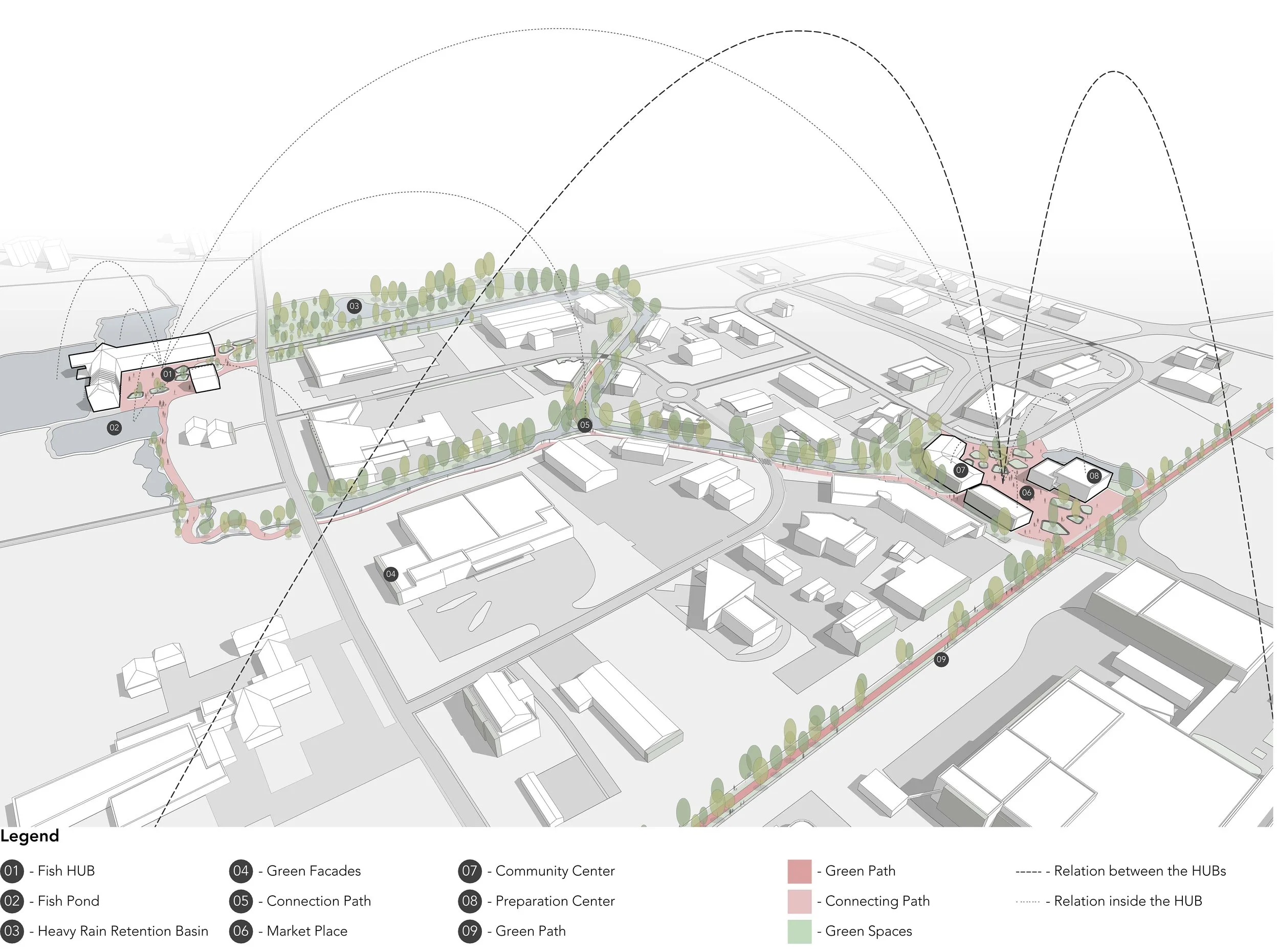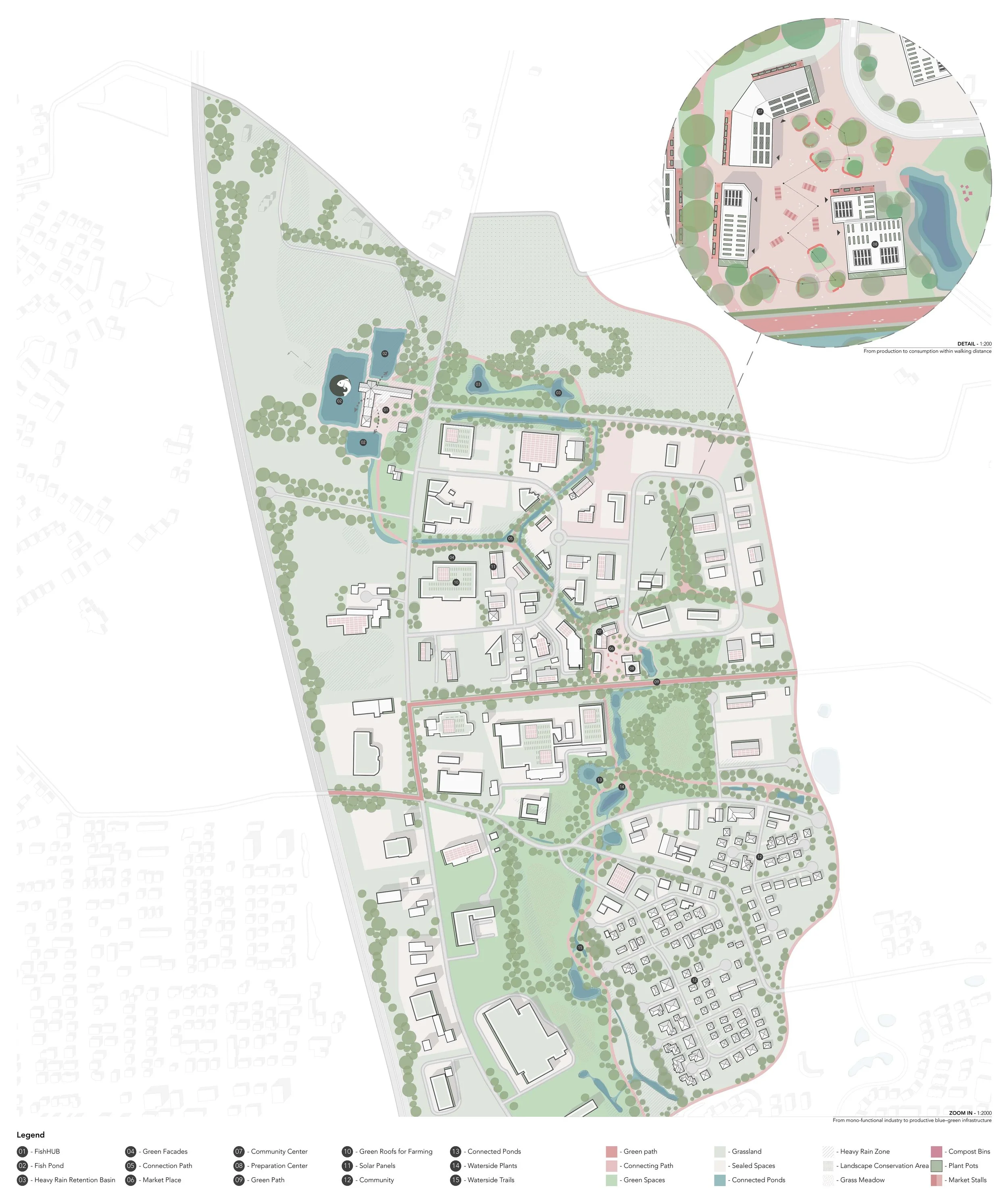 Das verbindende Element ist der Green Path: eine durchgängige, blau-grüne Infrastruktur, die alle Produktionsorte, Marktplätze und Gemeinschaftsräume miteinander verbindet. Entlang dieses Weges entstehen neue Aufenthaltsorte, Marktflächen, Bildungsangebote und klimatisch wirksame Freiräume. Bestehende versiegelte Flächen werden schrittweise zurückgebaut, Regenrückhaltebecken integriert und industrielle Dachflächen für Solarenergie sowie Dach- und Fassadenfarmen genutzt.