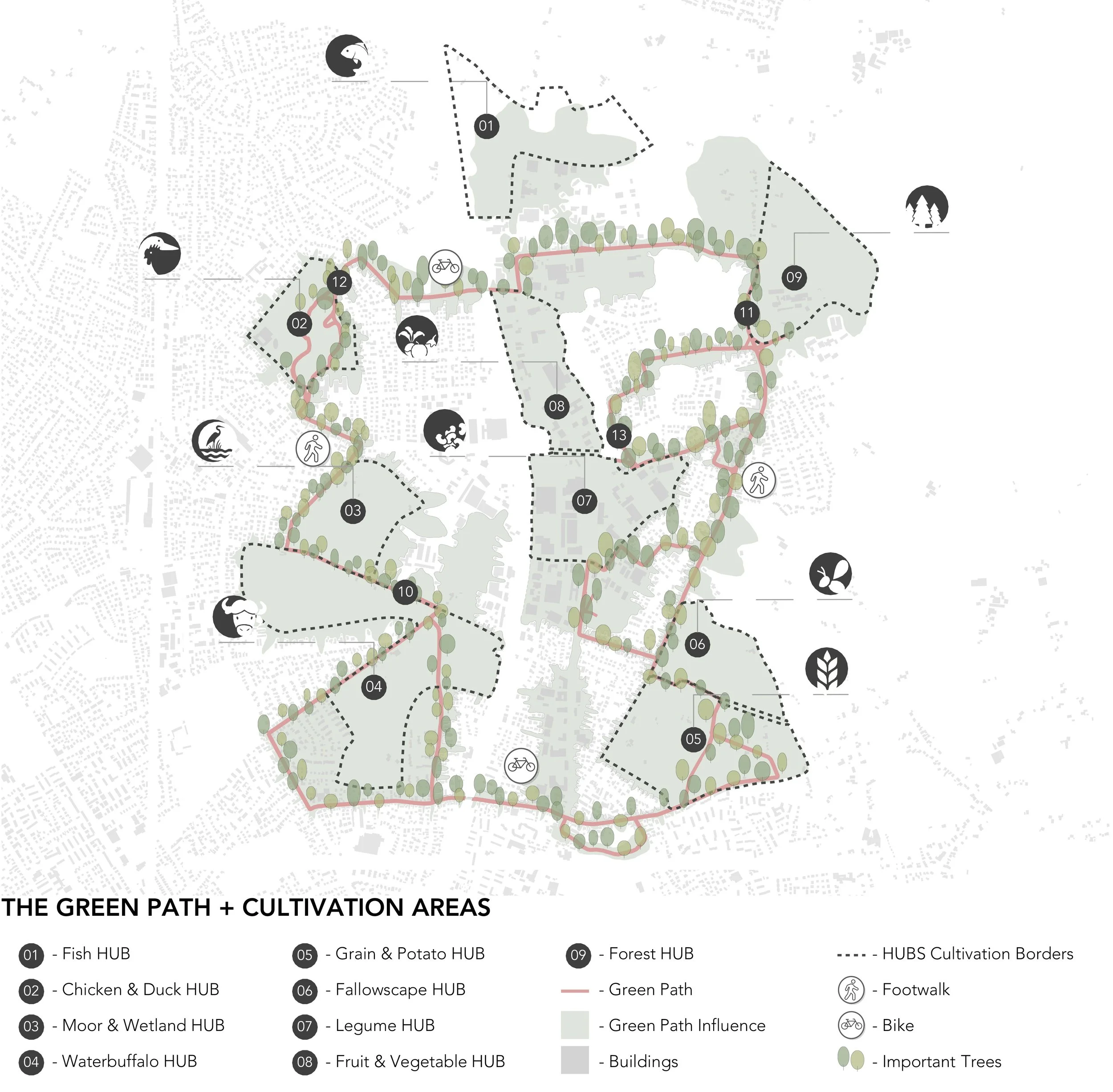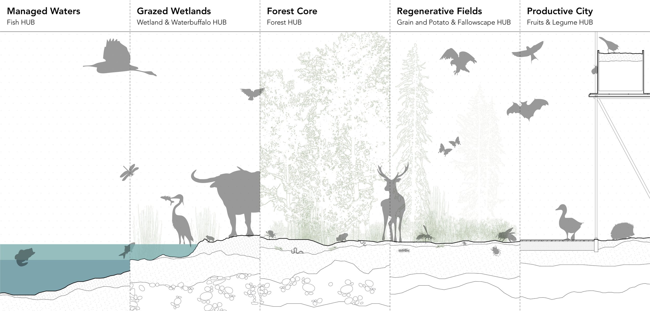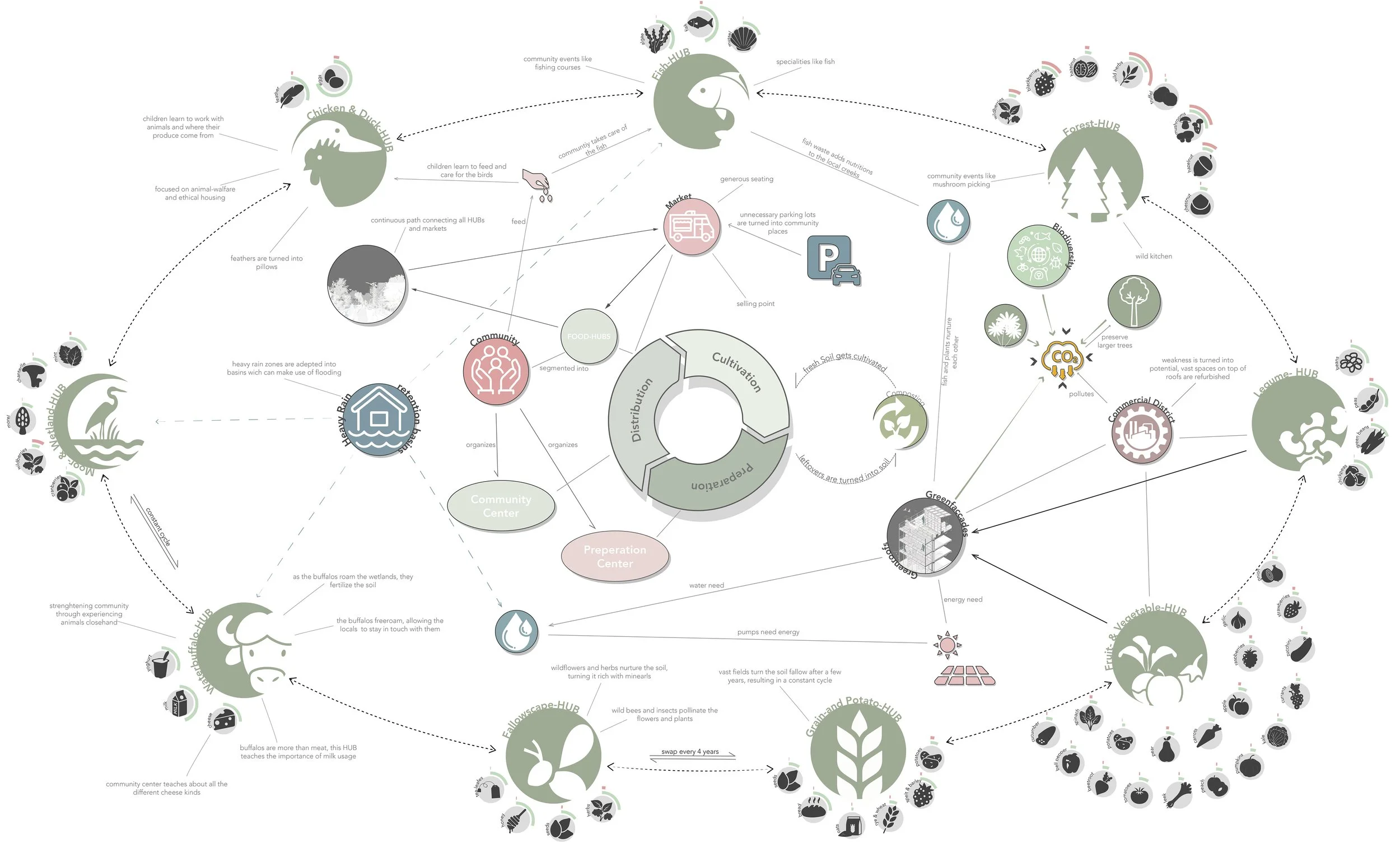 Das Konzept basiert auf einem Netzwerk aus Food Hubs – produktiven Landschaftsräumen für Fisch, Getreide, Gemüse, Leguminosen, Waldprodukte, Wasserbüffel, sowie Moor- und Feuchtgebiete. Jeder Hub übernimmt eine spezifische Funktion innerhalb eines ausgewogenen Ernährungssystems und ist räumlich wie funktional miteinander verknüpft.